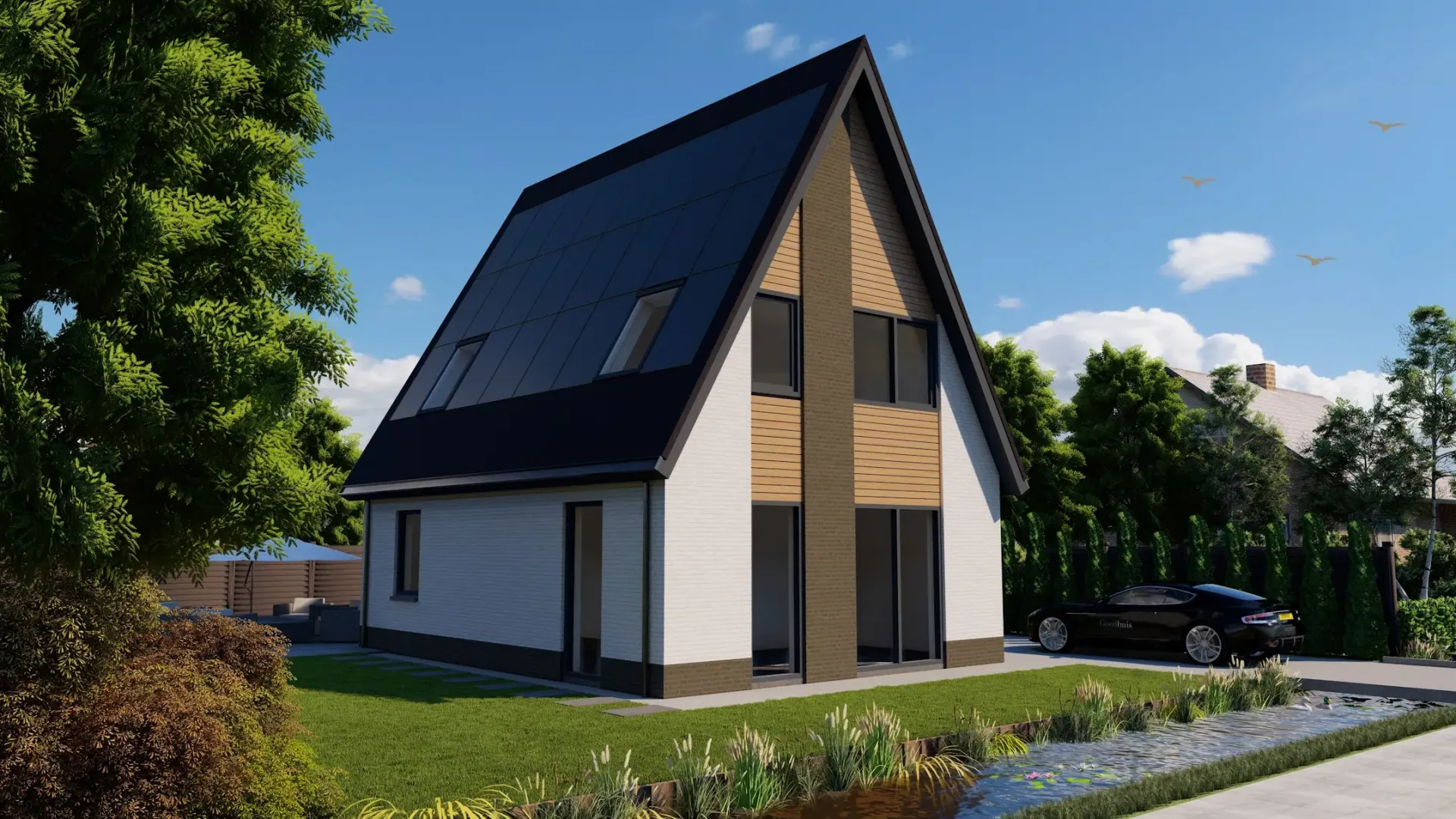 Een eigentijdse uitvoering met horizontale geveldelen van zwart Zweeds rabat hout. De woning is voorzien van een mastgoot van zink, witte kozijnen zonder roedes en een plint die circa 30 centimeter boven peil ligt. Het dak is afgewerkt met golvende antraciet betonpannen.