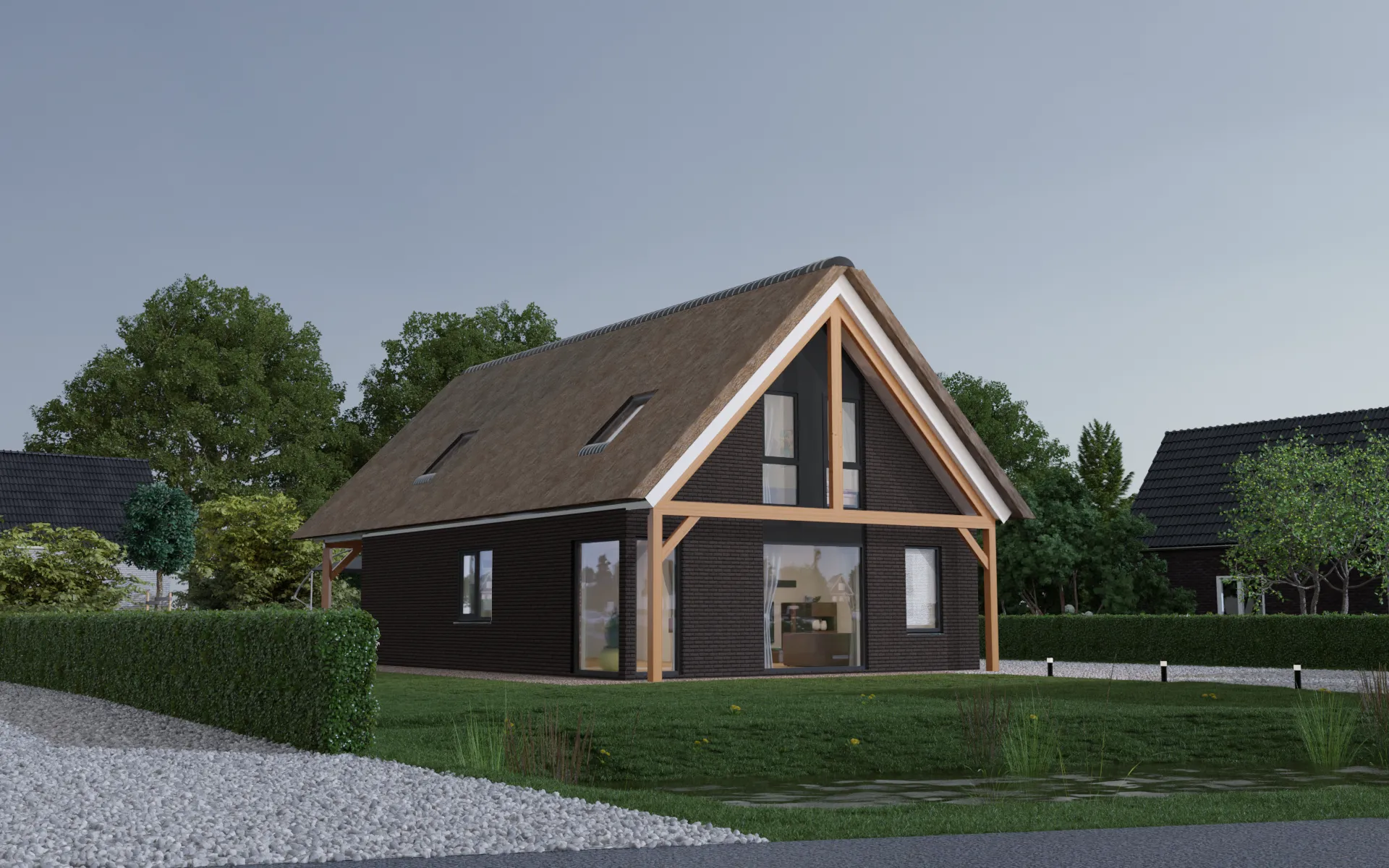 Deze uitvoering bestaat volledig uit antraciet metselwerk en valt op door het rieten dak dat de woning een exclusieve uitstraling geeft. Zowel aan de voor- als achterzijde is een overstek aanwezig, waardoor de woning een luxueus en ruimtelijk karakter krijgt.